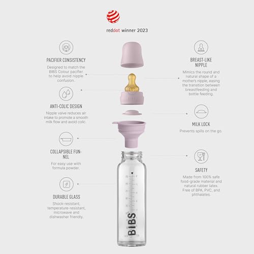 BIBS Baby Glass Bottle. Anti-colic. Round Natural Rubber Latex Nipple. Supports Natural Breastfeeding, 225 ml, Dusky Lilac