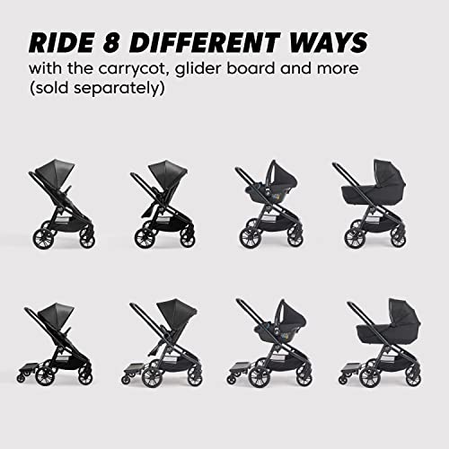 As one of the most compact-folding 4-wheel modular strollers, the Baby Jogger City Sights Stroller is ready for wherever the day takes you. The one-hand fold on this lightweight stroller makes it easy to pack up and store, cutting down your get-out-the-door time so you can spend more of the day on new adventures. All-terrain wheels and suspension mean more paths and pavements to roam, while the reversible seat lets your child see everything, in any direction, along the way. The reclining toddler seat, adjustable calf support, and large UV 50+ canopy keep comfort levels high and spirits up. Vegan leather accents on the adjustable handlebar and included belly bar give it a luxe look and feel. Infant car seat adapters, carrycot and glider board (sold separately) create 8 modes of use – perfect for going even bigger.