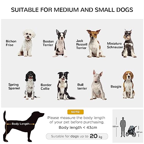 PawHut Pet Stroller Jogger for Medium, Small Dogs, Foldable Cat Pram Dog Pushchair w/Adjustable Canopy, 3 Big Wheels – Grey