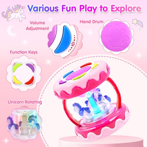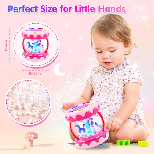 Suitable for Tummy Time: Pink baby musical toys for 1 year old girls,encourages imaginative play and creative expression and develops listening skills and musical awareness. The cylindrical design makes it easy for the toy to roll on the ground, attracting the crawling of infants.