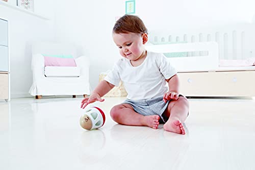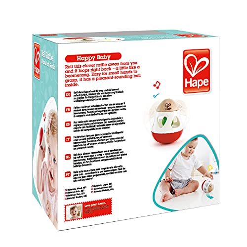 Hape E0016 bell rattle-roll this clever rattle away from you and it loops right back – a little like a boomerang. Easy for small hands to grasp, it has a pleasant sounding bell inside. Suitable from birth.