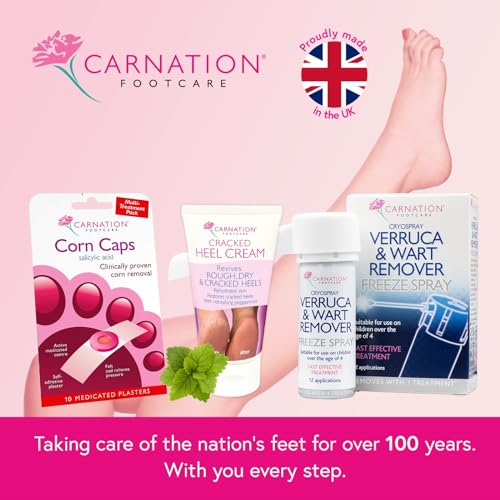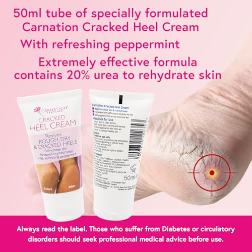 CARNATION Footcare Cracked Heel Cream revives rough, dry and cracked heels. It is formulated with 20% urea to quickly rehydrate the skin. With peppermint oil to leave the feet smelling fresh and feeling cool. Visible results in 3 days. Continue to use after heels are revived to maintain healthy skin.