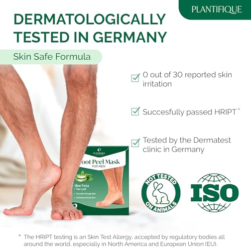 PLANTIS FORMULA: The Foot Peel Mask for Men utilizes a unique Plantis formula designed to effectively remove calluses and alleviate cracked feet. By targeting the deepest layers of the skin, this formula ensures a painless exfoliation process. The active ingredients gently dissolve the bond between old cells on the surface of your feet, allowing new fresh skin to emerge. Aloe Vera extract soothes the skin, deeply moisturizes and repairs dry skin.