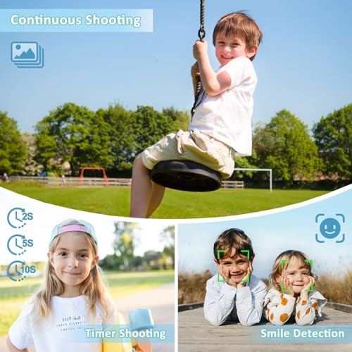 【Multifunction Digital Camera】1080P Digital Cameras Features with Powerful 16X Digital Zoom. The pocket camera supports anti-shake function, self-timer, face recognition, continuous recording, fill light. All functions serve you a better shooting experience and are easier and easier to use for kids, students beginners to use.
