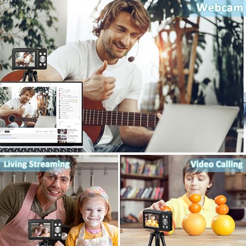 【Webcam to Real Time Sharing】Digital Camera with Anti-shake can serve as a webcam so you can enjoy video calls or live streaming. Just connect your phone to an OTG adapter (not included) to share your results directly to Tiktok, YouTube, Facebook or other social media in real time or transfer them to your computer using the included USB cable and then share them to social media.