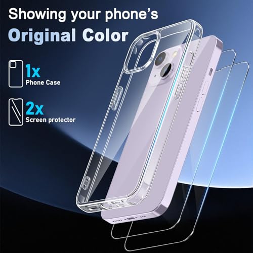Fiyoarbb Clear Case for iphone 14 with 2 Pack Tempered Glass Screen Protector, Non-Yellowing Shockproof Phone Bumper Cover, Hard PC Anti-Scratch Clear Back (Clear)