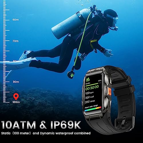 ⌚10ATM&IP69K Waterproof – KOSPET X1 Smart watch for men with military-quality solid and corrosion-resistant titanium body, fully enclosed and ultra-thin shell, so that its waterproof level reaches 10ATM & IP69K, you can confidently wear it during swimming and diving activities. Activity trackers has proven its resilience under extreme condition by passing drilling, crushing and hot steam washout tests, making our sports bands ideal for use in environments with high temperatures and pressure.
