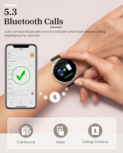 【Convenient Bluetooth Calls】Our smartwatch women is equipped with updated BLE5.3 chip that allows you can easily answer, make and reject calls on your smart watch for Android iOS with a Bluetooth connection. You can also receive message/app notification, listening to music via the womens smart watch directly from anywhere at any time after pairing with the app via Bluetooth. Compatible system: Android 4.4 or higher / IOS 9.0 or higher.
