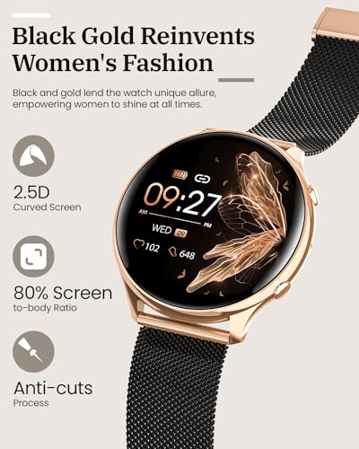 【Black Gold Beyond Classic】The latest smart watches for women features a 1.39 inch full touch screen with high resolution of 360 x 360 and curved 2.5D glass, the view is clearer and easier on the eyes. Only weight 39g, the fitness watch for women is suitable for you to wear for long time. The body is golden, with the elegant black milanaise bracelet and a comfortable silicone strap, classy and elegant, fashionable and versatile.