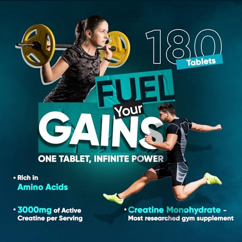 Creatine Monohydrate 3000mg – 180 Tablets – Pre-Workout Energy & Creatine Tablets for Men & Women – Vegan & Keto Pre-Workout & Post-Workout Gym Tablets – Creatine Monohydrate Powder Tablets