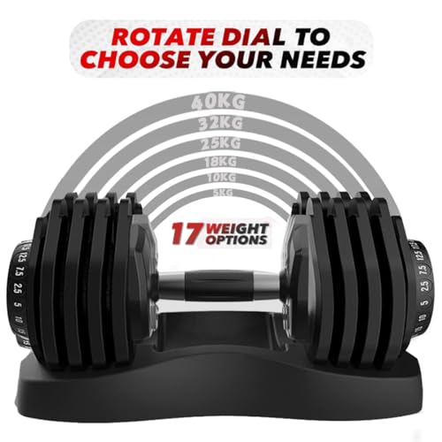 💪【 17 in 1 weight adjustable】 Included are 17 weights between 5-40kg. Our adjustable dumbbell set goes from 5kg (11lbs) to 40kg (88lbs) in 2kg increments with a turn of the dial. Simply select, twist and lift!Increments are: Increments are: 5kg, 7kg, 9kg, 11kg, 13kg, 15kg, 18kg, 20kg, 22kg, 25kg, 27kg, 29kg, 32kg, 34kg, 36kg, 38kg, 40kg.