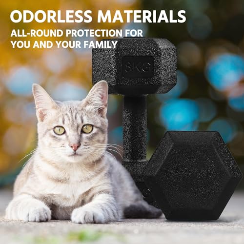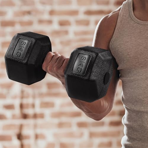 【Durable & Odor-free】These durable hex dumbbells are sold as a set of two, each weighing 8 kg. They are filled with a combination of sand and iron, complete with a built-in metal rebar for enhanced strength. The PVC coating not only adds an extra layer of protection to the floor, but also spares you from the unpleasant metallic odor that may linger after your workout.