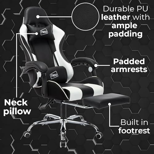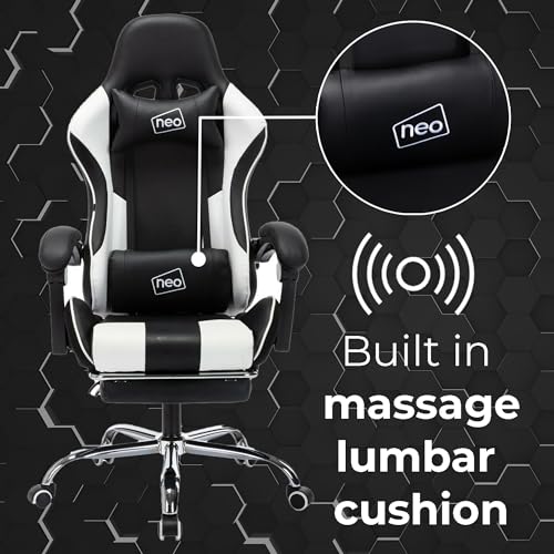 Neo Leather Gaming Racing Chair Footrest, Headrest and Lumbar Massage, Height Adjustable with Swivel Seat for Home/Office (White)
