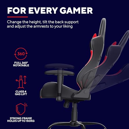 FULLY ADJUSTABLE – This PC gaming chair features a 360 Degree rotatable seating and a high – quality class 4 gas lift to set the right height. Adjust the height of the armrests and find the right gaming posture thanks to a tilting seat and a 90-180 Degree tiltable backrest
