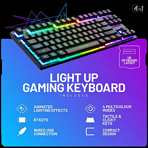 Compact LED Gaming Keyboard with 4 colour modes and tactile keys.