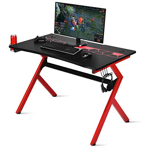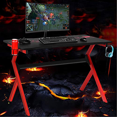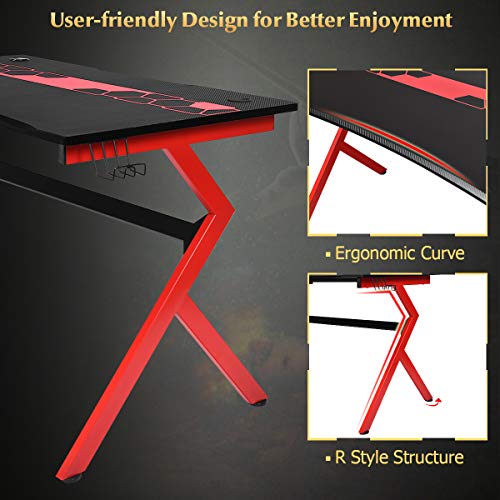COSTWAY Gaming Desk with Cup Holder and Headphone Hook, R/K-Shaped Racing Style E-Sports PC Gamer Table, Ergonomic Study Writing Computer Workstation (Black+Bed, 115 x 66 x 77cm)