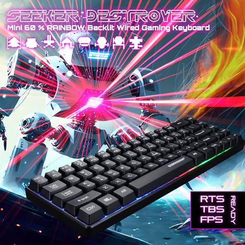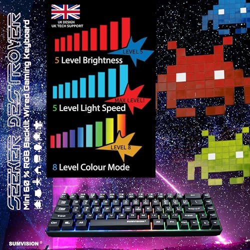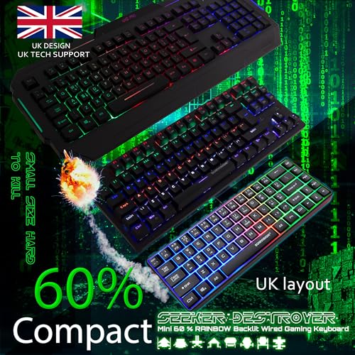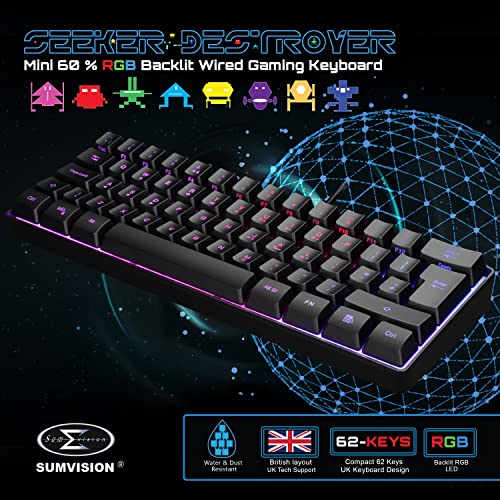 PC Gaming Keyboards SUMVISION SEEKER DESTROYER 60% Percent Pro Gaming Keyboard Wired USB Mini Compact Backlit Mechanical Feel Apple Mac Windows 11 PC PS5 Xbox Series X/S (FREE UK TECH SUPPORT)