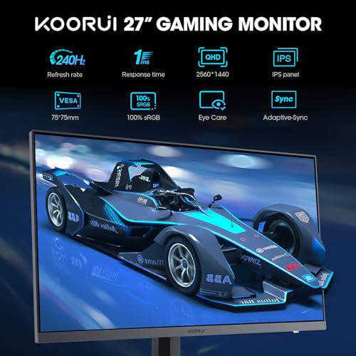 KOORUI 27 Inch Gaming Monitor, QHD(2560 ×1440) IPS Panel Computer Monitors, 240Hz, 1ms, Eye Care, HDMI 2.0 * 2/DP 1.4, VESA Compatible