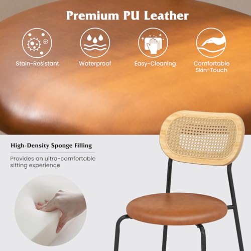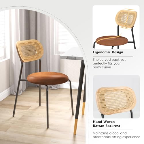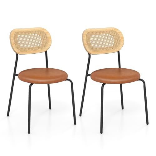COSTWAY Dining Chair Set of 2, Upholstered Kitchen Chairs with Rattan Backrest, PU Leather/Linen Fabric Padded Seat, Leisure Accent Leisure Chairs for Living Dining Room (Linen Fabric Coffee Seat)