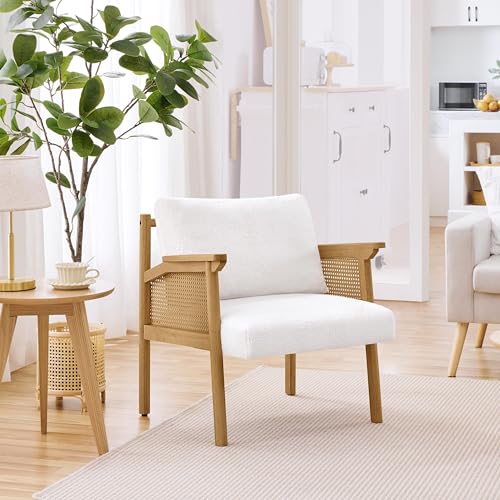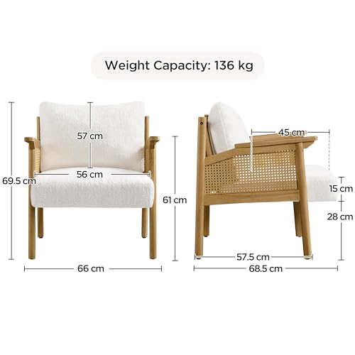 Yaheetech Accent Chair, Boucle Vanity Chair with Rattan Back&Arms Wood Armchair with Loose Back Pillow for Living Room Bedroom White