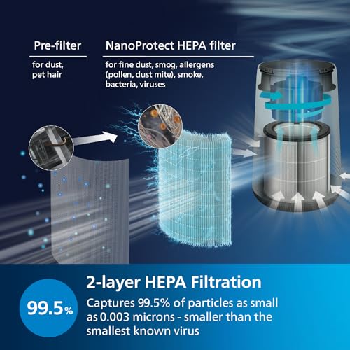 LONG LASTING FILTER WITH SMART CHANGE INDICATOR: The filter lasts up to 1 year4, so you can save money in the long term vs. other air purifiers. We recommend using the original Philips filter replacements to get the best performance from your purifier – compatible with FY0194 (HEPA) or FY0293 (HEPA + Active Carbon).