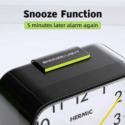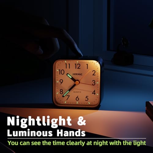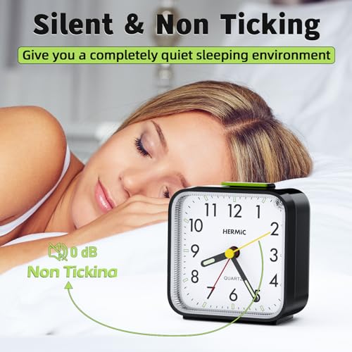 HERMIC Alarm Clocks Bedside Silent Non Ticking Battery Powered Travel Small Analogue Clock with Light Snooze Luminous Pointer for Bedroom Office Included Battery [Energy Class A+++]