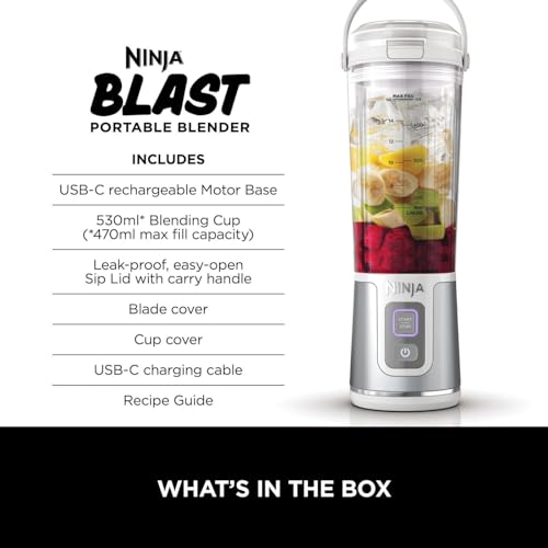 Ninja Blast Portable Blender, 530ml, Leakproof Lid & Sip Spout, Powerful Cordless Mini Blender, Rechargeable, Portable Smoothies, Protein Shakes, Blends Ice & Frozen Fruit, White, BC151UKWH
