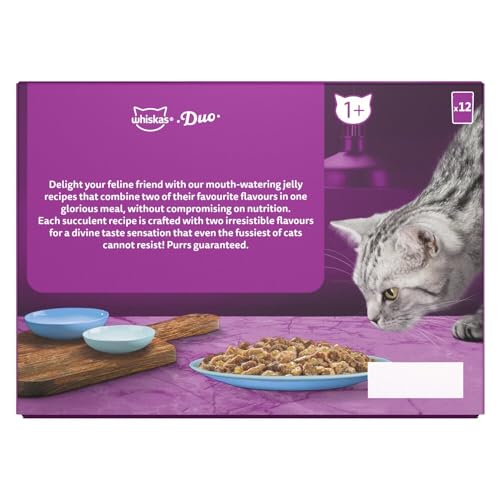 Whiskas 1+ Duo Ocean Delights adult cat food pouches in jelly combine two of your cats favourite flavours in one glorious meal, without compromising on nutrition. Each wet cat food pouch is crafted with two irresistible flavours for a divine taste sensation that even the fussiest of cats cannot resist! Purrs guaranteed.
