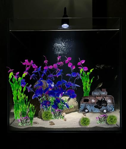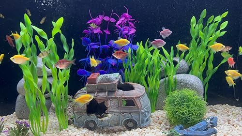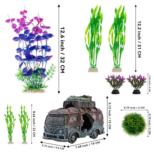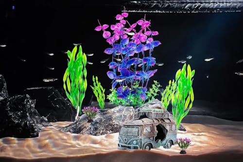 BEGONDIS Camper Van Tourer with 8 Pcs Plastic Plant Set Artificial Polyresin Aquarium Ornament Aquatic Model Decoration Fish Tank Marine Decor Ornaments (Car)