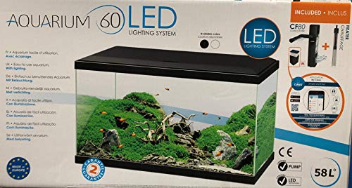 Complete with lid, LED lights, Internal Filter & 50w Heater. An aquarium endowed with complete equipment for discovering aquarium keeping in confident fashion, equipped with a motor, a heater and a biological filter. The Ciano filter ensures an optimum renewal of water and perfect maintenance of the aquatic balance and the WATER CLEAR Ciano dose makes the water crystal clear and eliminates odors. Equipment Included 1 Biological filter CF80 Ciano 1 LED lighting system CLA60 Ciano (8W – 18VDC); 1 Converter LED (18VDC) 1 Water Pump 260 l/h 1 Heater 50W 1 Dose WATER CLEAR “M” 1 FOAM “L” 1 Instruction Guide. Supplied UK Plugs.