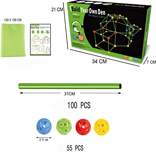 [Fort Construction Toys Kit] Include 55 colorful balls + 100 sticks+1 Tent cloth+1 Instruction. Just insert the plastic tube into the hole of the sphere to fix the plastic tube, very simple.,easy to construct. Balls are solid and easy to connect. Kids will have endless imagination to build various shape.