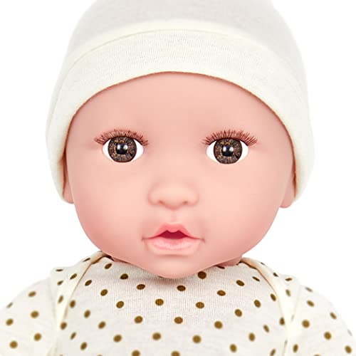 36 cm baby doll with beautiful brown eyes, soft eyelashes and cute face. With flexible hands and feet and a cuddly, soft body for cuddling