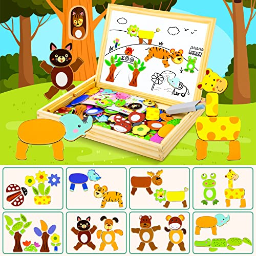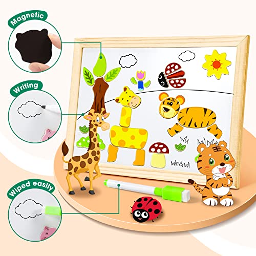 COOLJOY Wooden Magnetic Puzzle Games, 100+ PCS Double Sided Jigsaw Animal Pattern Drawing Easel Blackboard Educational Wood Toys for Boys Girls Kids Toddler 3 4 5 Year Olds