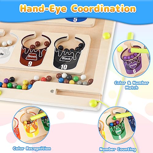 【Montessori Toys for 2-5 Year Old】This wooden toys has built-in 10 “paint pots” representing the numbers 1-10, along with 55 magnetic beads in 10 vibrant colors matching corresponding numbers for kids to count. It helps kids age 2-5 to learning colors and counting numbers. (Please keep the pen upright for better use)