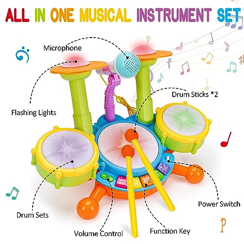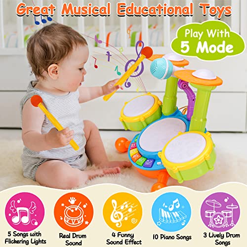 Kids Drum Set Musical Toys for Toddlers 1-3 with 2 Sticks Microphone Instruments Piano Light Up 1 Year Old Boy Girl Gifts 6 12 18 Month Learning Developmental Toddler Age 2-4 Birthday Gift